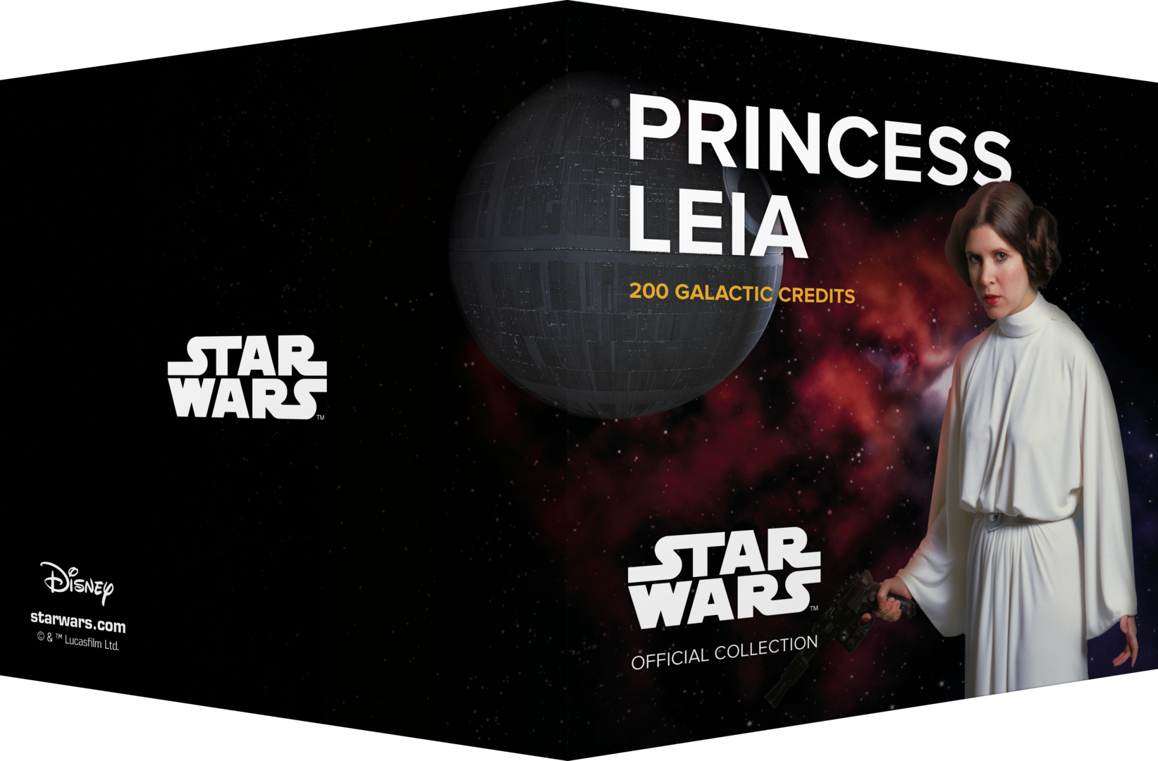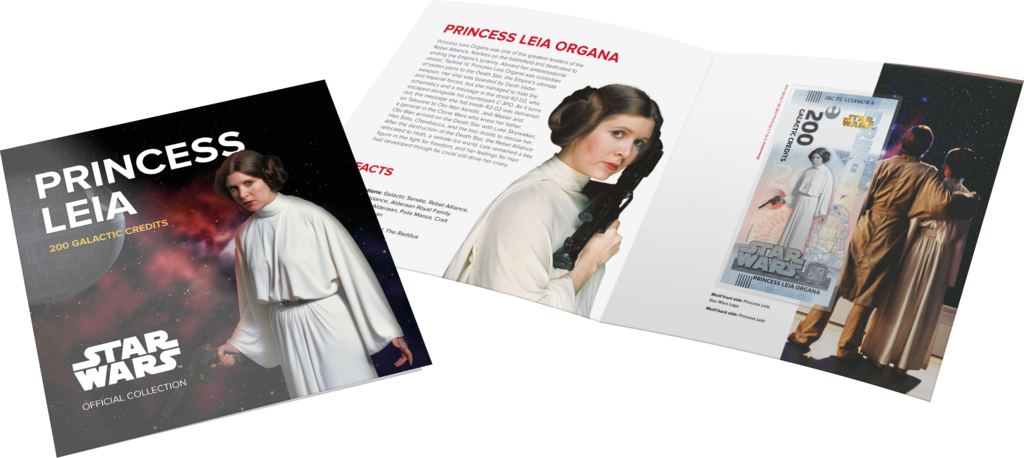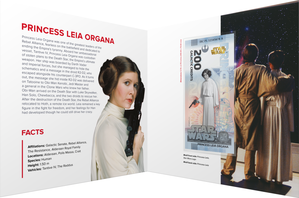 This 200 Galactic Credits souvenir note is dedicated to Princess Leia. The note is part of the Star Wars Series, which comprises a total of eight notes and is an official collection of the Walt Disney Company. It is made from genuine banknote paper and has a watermark and UV design as security features. While the obverse is vertically oriented, the reverse is horizontal. In addition to the main motif, the Star Wars logo is applied to the obverse as a gold foil patch. The folding card, designed exclusively for the note, provides interesting background information about Leia.
