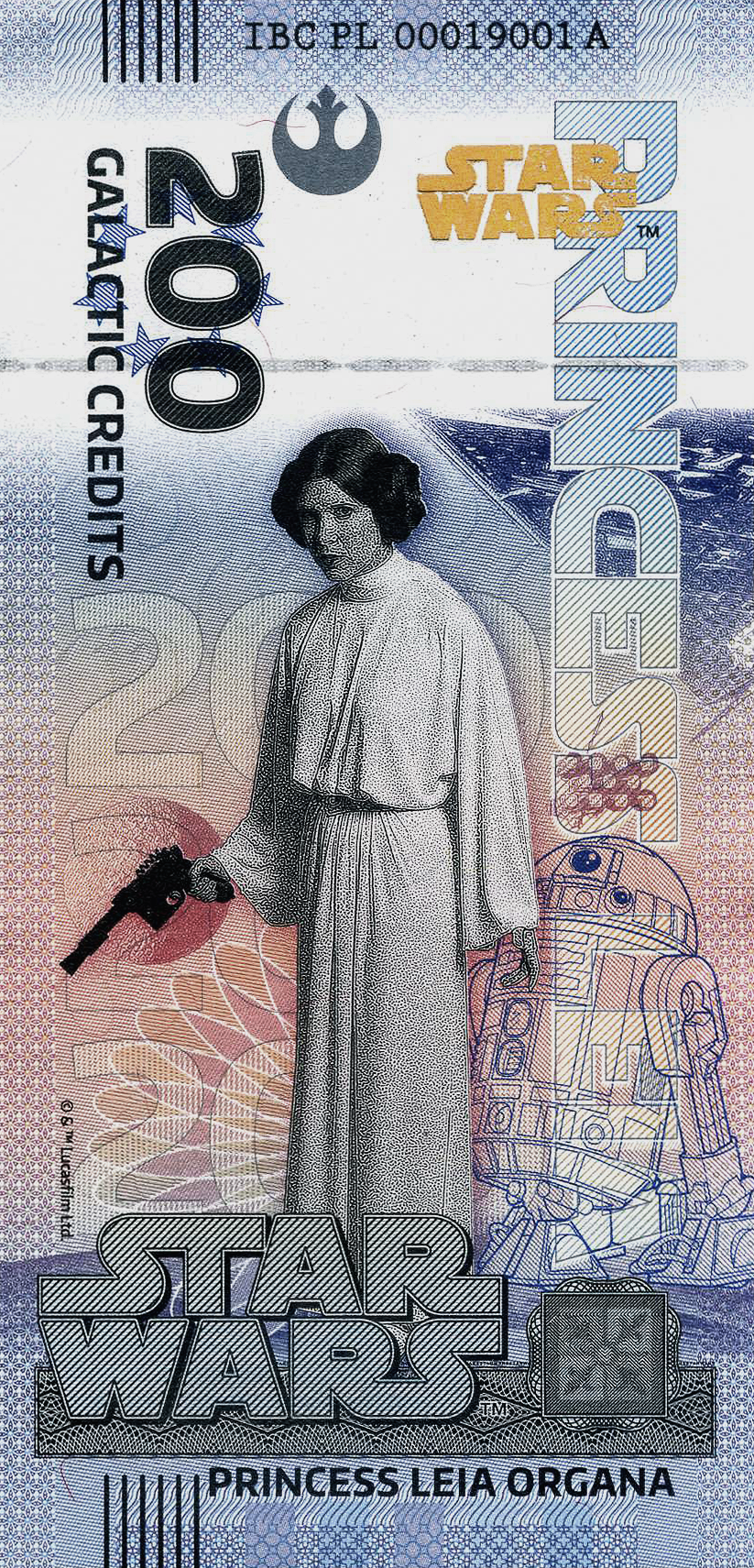 200 Galactic Credits Front side: Princess Leia Organa, R2-D2, Star Wars™ logo, Rebel Alliance symbol, seven stars, Imperial Star Destroyer pursuing the Tantive IV, moon of Tatooine |