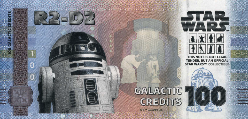 100 Galactic Credits Front side: R2-D2 and C-3PO, Star Wars™ logo, Rebel Alliance symbol, R2-D2 |