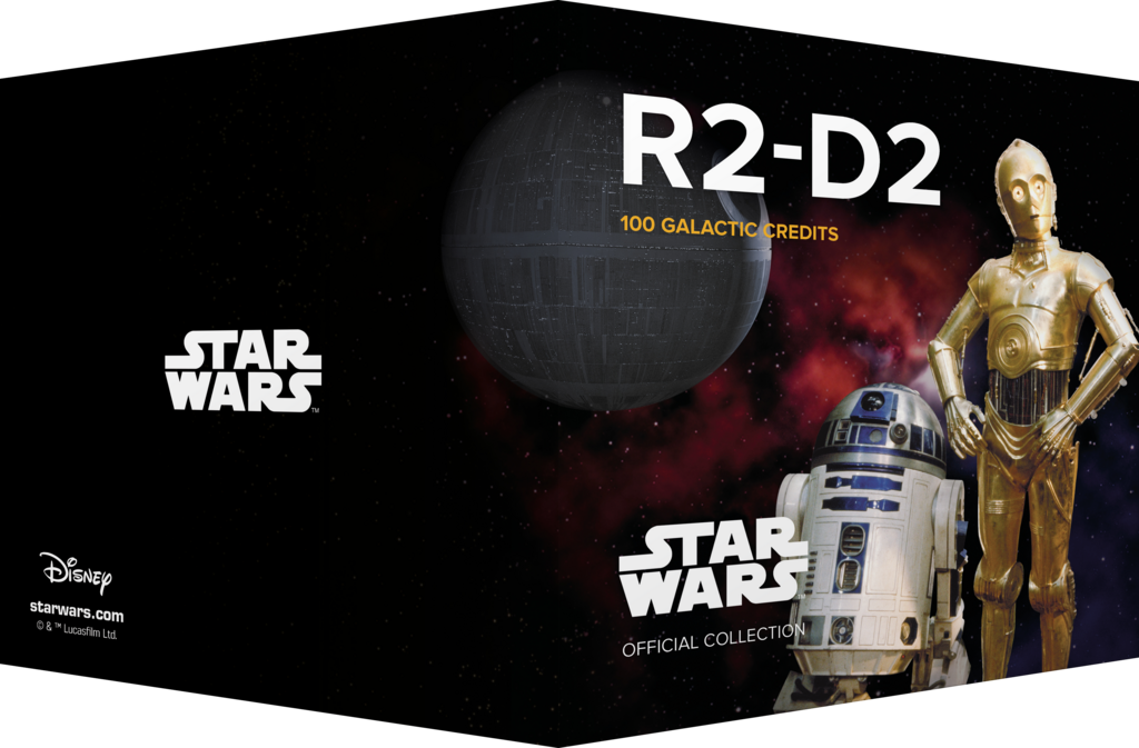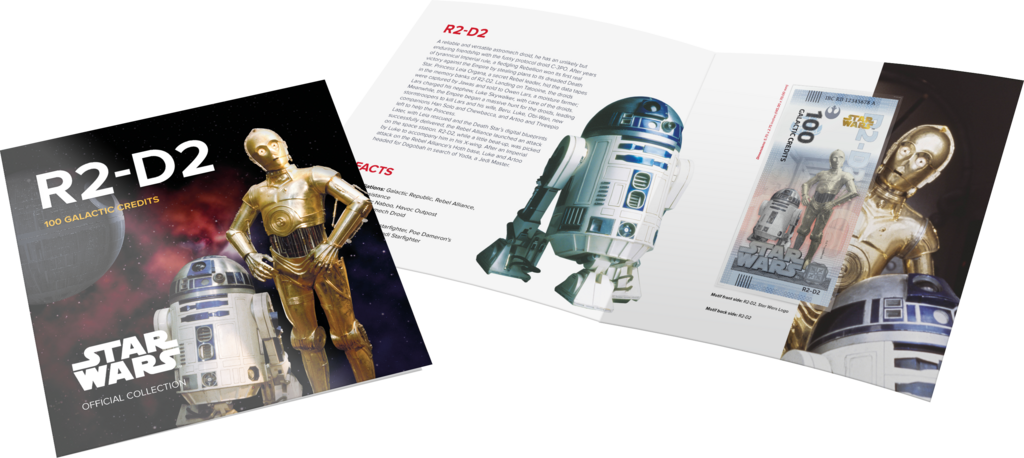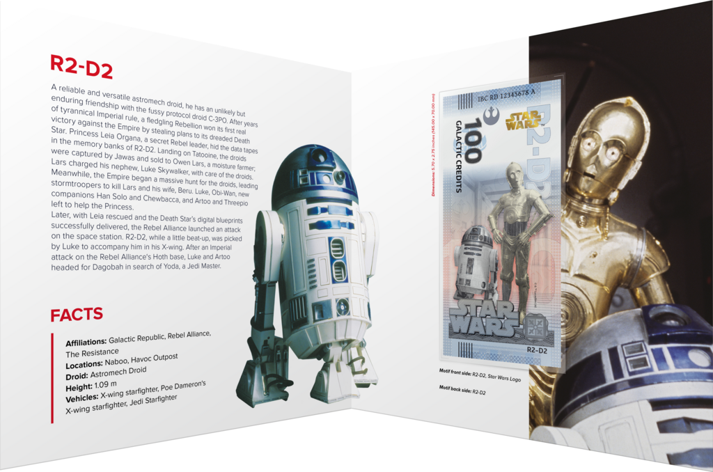 This 100 Galactic Credits souvenir note is dedicated to the droid R2-D2 from the Star Wars saga. The note is part of the Star Wars Series, which comprises a total of eight notes and is an official collection of the Walt Disney Company. It is made from genuine banknote paper and has a watermark and UV design as security features. While the obverse is vertically oriented, the reverse is horizontal. In addition to the main motif, the Star Wars logo is applied to the obverse as a gold foil patch. The folding card, designed exclusively for the note, provides interesting background information about R2-D2.