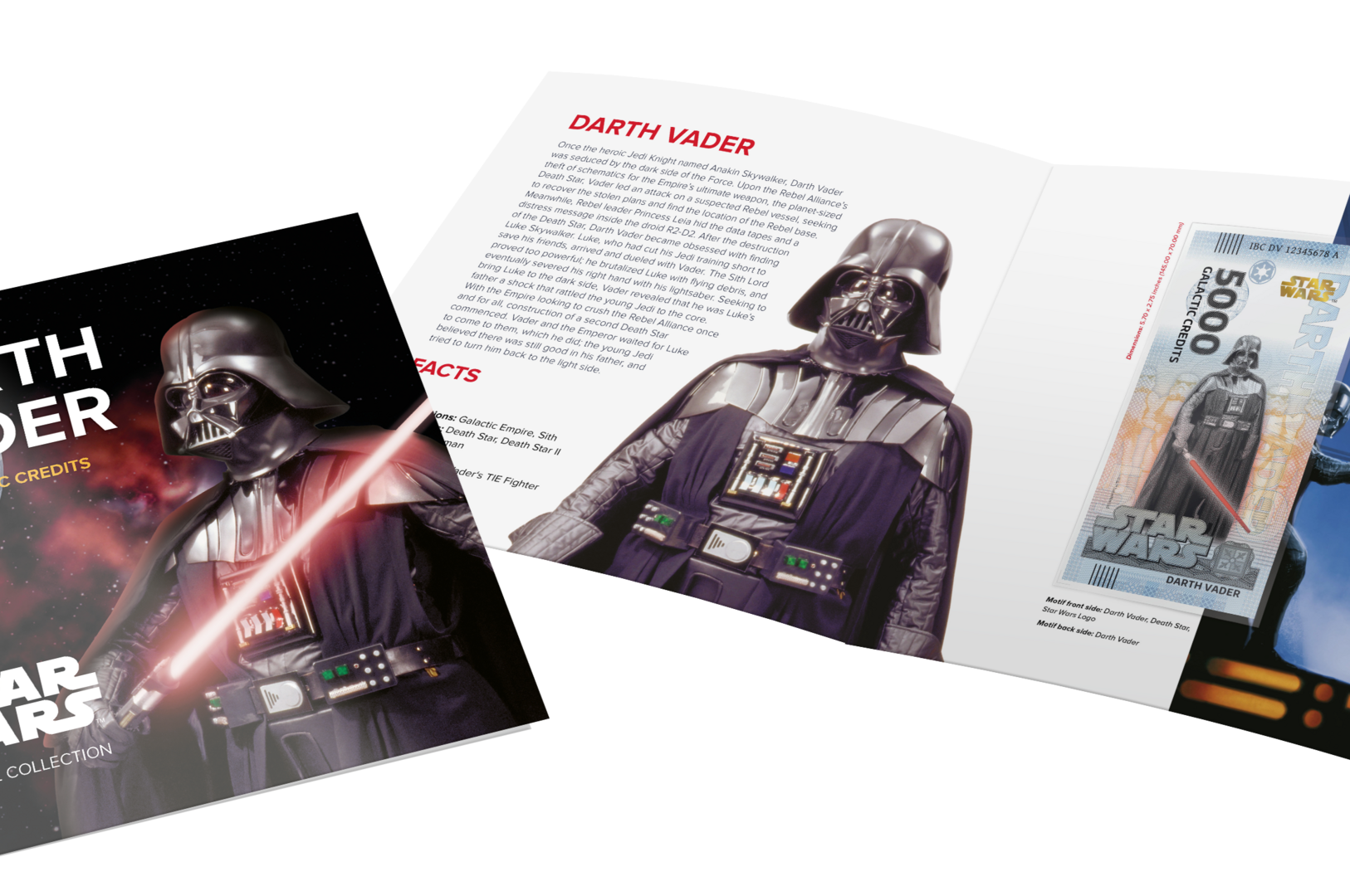 Die Galactic Credits-Scheine wurden hochwertig produziert und verfügen über Wasserzeichen, Goldfolie sowie UV-Farbe. Auf der Vorderseite ist jeweils ein bestimmter Charakter als Motiv abgebildet. Es handelt sich um Meister Yoda, Han Solo, Chewbacca, R2-D2, Prinzessin Leia, Luke Skywalker, Obi-Wan Kenobi und Darth Vader. Neben den Hauptmotiven sind jeweils zu den Figuren passende Raumschiffe, Waffen oder Film-Szenen dargestellt. Zu jedem Schein gehört eine eigens dafür gestaltete Klappkarte.