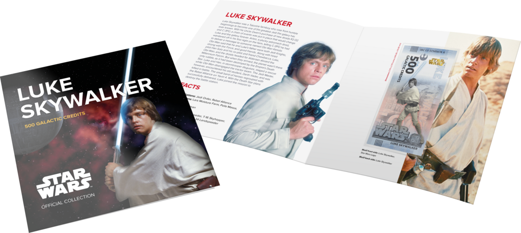 Dieser 500 Galactic Credits-Souvenirschein ist Luke Skywalker gewidmet. Der Schein gehört zu der achtteiligen „Star Wars“-Serie, die eine offizielle Kollektion der Walt Disney Company ist. Er wurde aus echtem Banknotenpapier produziert und verfügt über ein Wasserzeichen sowie ein UV-Design als Sicherheitsmerkmale. Während seine Vorderseite ein vertikal ausgerichtetes Design aufweist, ist die Rückseite horizontal ausgerichtet. Zusätzlich zu dem Hauptmotiv ist auf der Vorderseite das Star Wars-Logo als Goldfolienelement aufgebracht. Die exklusiv zu dem Schein entworfene Klappkarte liefert interessante Hintergrundinformationen zu Luke.